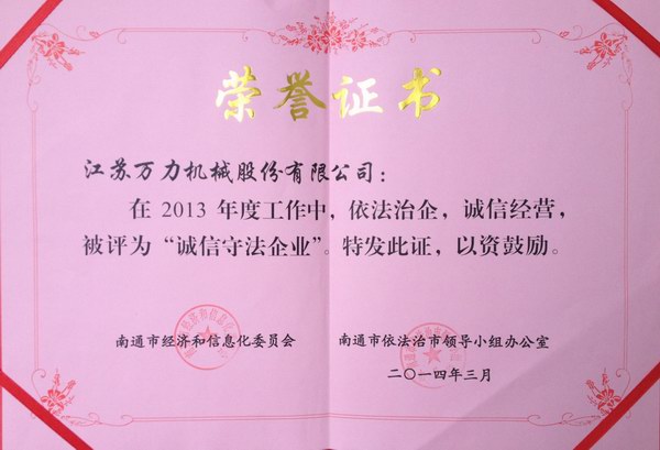 2014年3月20日,公司被南通市經(jīng)濟(jì)和信息化委員會(huì)、南通市依法治市領(lǐng)導(dǎo)小組辦公室聯(lián)合表彰為“2013年度誠(chéng)信守法企業(yè)”。