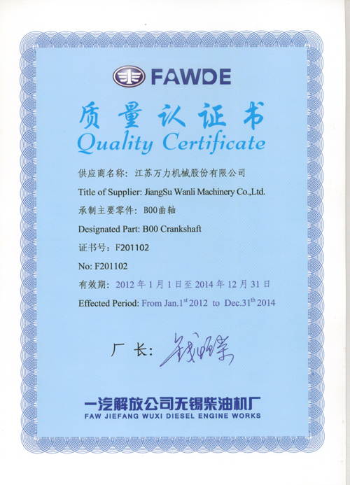 Quality certification from Faw Jiefang, Wuxi Diesel-engine Works