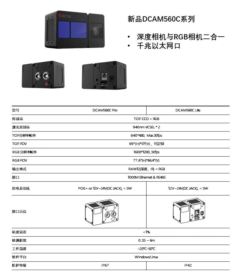 DCAM560C產(chǎn)品系列集成了團(tuán)隊(duì)近年來的研究成果,將2D RGB圖像與3D ToF面陣相機(jī)技術(shù)相結(jié)合,輸出在時(shí)間和空間上重合的RGB和3D圖像,每個(gè)像素都參與測距,不僅可以在獲取XY軸方向圖像的基礎(chǔ)上還能獲取Z軸方向上的距離信息,從而獲得高精度的深度圖,實(shí)現(xiàn)“三次元空間的感知能力”,用以滿足工業(yè)級客戶不同的使用場景,適用于工業(yè)自動化,智能物流,智慧駕駛,智能安防,3D建模等需要3D感知物體與環(huán)境、構(gòu)建3D模型并進(jìn)行分析的領(lǐng)域。