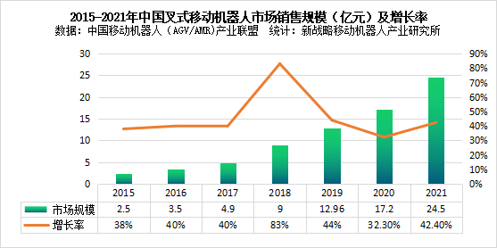 圖表:2015-2021年中國叉式移動(dòng)機(jī)器人市場(chǎng)銷售規(guī)模(億元)及增長(zhǎng)率