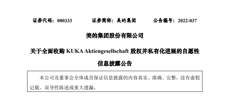 美的收購KUKA的私有化進程自愿性信息披露
