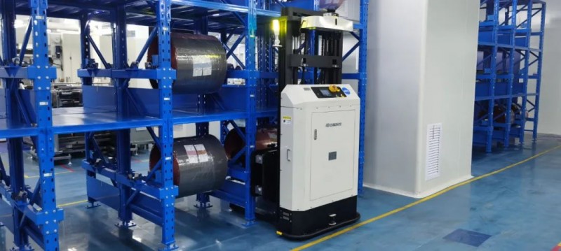 據了解,在涂布分切的前段卷料環(huán)節(jié),又包括上設備與上緩存庫兩個方面。電池生產節(jié)拍緊湊,設備對接精度高,創(chuàng)智針對這個環(huán)節(jié)深度定制研發(fā)了舉升式與叉臂式兩款AGV產品。叉臂式AGV相當于堆高叉車的懸臂,能夠實現上設備及緩存庫的高精度全自動對接。