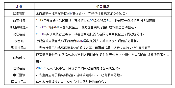 圖表:2021年光伏行業(yè)新增AGV/AMR類型分布整體來(lái)看,當(dāng)前光伏行業(yè)的AGV/AMR應(yīng)用還處于前期的階段,整體需求還未完全釋放,競(jìng)爭(zhēng)相對(duì)較低,但伴隨著光伏行業(yè)近兩年投資擴(kuò)產(chǎn)風(fēng)潮的盛行,以及光伏企業(yè)對(duì)AGV/AMR產(chǎn)品認(rèn)知度的不斷提高,光伏行業(yè)對(duì)AGV/AMR需求也在逐步放量。當(dāng)前,光伏行業(yè)已經(jīng)成為AGV/AMR企業(yè)重點(diǎn)布局領(lǐng)域之一。由于光伏行業(yè)對(duì)AGV/AMR的需求以自然導(dǎo)航類為主,當(dāng)前,聚焦光伏行業(yè)的AGV/AMR企業(yè)也大部分以專注于自然導(dǎo)航(SLAM)類產(chǎn)品的企業(yè)為主,如藍(lán)芯科技、斯坦德、快倉(cāng)智能、極智嘉、海康機(jī)器人、迦智科技、佳順智能、中興通訊、玖物互通等。這些企業(yè)依托自然導(dǎo)航核心技術(shù),結(jié)合光伏行業(yè)需求特點(diǎn),也相繼形成了光伏行業(yè)解決方案。