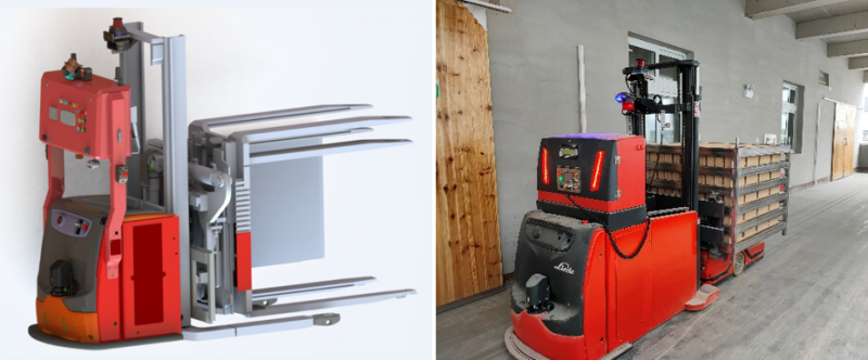01 該項目共部署了53臺AGV,其中包括36臺背負式AGV,10臺叉車式AGV以及7臺翻轉(zhuǎn)式AGV。在NDC8平臺的加持下,AGV不僅能夠兼容激光反射板、磁條、磁釘和二維碼等多種導航方式,還能支持差速、舵輪、雙舵輪及多舵輪等多種輪系結(jié)構(gòu)。一套解決方案即可滿足客戶不同應(yīng)用場景的需求。