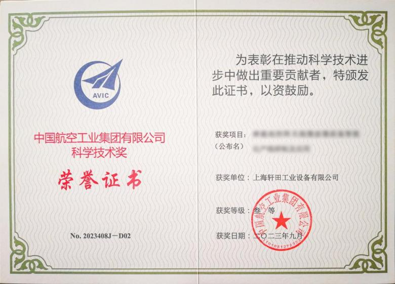 憑借持續(xù)技術(shù)創(chuàng)新能力、研發(fā)能力和技術(shù)領(lǐng)先能力,軒田科技榮膺中國航空工業(yè)集團有限公司“科學(xué)技術(shù)獎”。