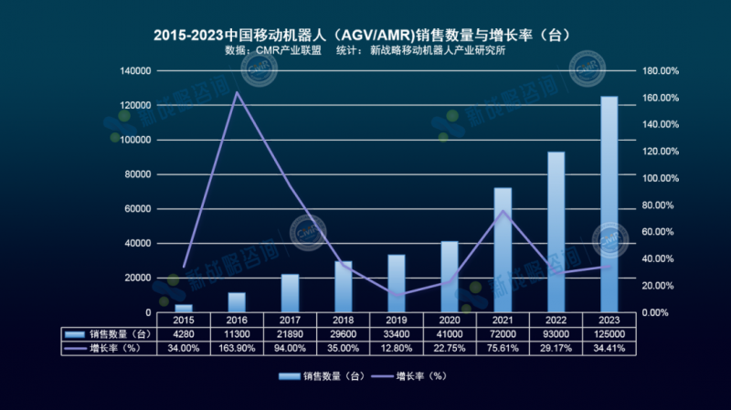 根據(jù)CMR產(chǎn)業(yè)聯(lián)盟數(shù)據(jù),新戰(zhàn)略移動機(jī)器人產(chǎn)業(yè)研究所統(tǒng)計,從2015年至2023年,中國市場移動機(jī)器人(AGV/AMR)產(chǎn)業(yè)年復(fù)合增長率達(dá)43.18% ;2023年中國移動機(jī)器人(AGV/AMR)銷售規(guī)模212億,同比增長14.59%;銷售數(shù)量125000臺,同比增長34.41%。