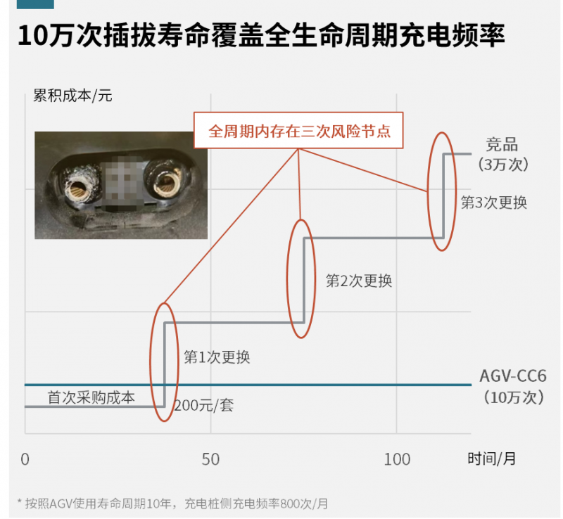 在移動(dòng)機(jī)器人的全生命周期內(nèi),與3萬(wàn)次插拔壽命的連接器相比,史陶比爾AGV-CC6連接器憑借高達(dá)10萬(wàn)次的插拔壽命,展現(xiàn)出了更為顯著的成本效益。具體而言,使用 AGV-CC6,10年內(nèi)僅需承擔(dān)首次采購(gòu)成本;競(jìng)品更換第一套備件后,累積成本就已遠(yuǎn)超AGV-CC6,還不包括其產(chǎn)生的大量人工成本和生產(chǎn)停機(jī)成本。此外,史陶比爾也在持續(xù)推進(jìn)本地化降本,使得AGV-CC6性價(jià)比更具優(yōu)勢(shì)。