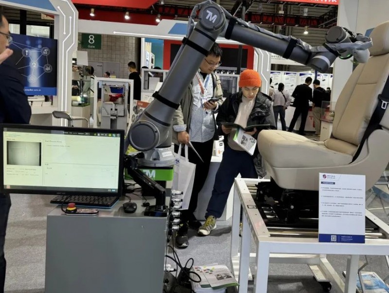 在慕尼黑電子生產(chǎn)設(shè)備展(Productronica China)的現(xiàn)場,達(dá)明機(jī)器人合作伙伴所展示的汽車座椅外觀檢測應(yīng)用,充分彰顯了視覺飛拍技術(shù)在外觀瑕疵檢測方面的優(yōu)勢。